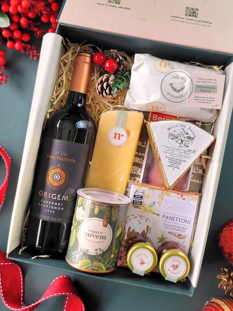Nossas cestas trazem a junção do design, sofisticação e uma curadoria que seleciona produtos diferenciados.Além das cestas de Natal todas as nossas cestas do site podem ir com a embalagem e decoração de Natal, basta selecionar essa opção na página da cesta.